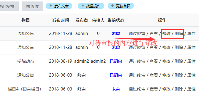 如果欄目內容需多級審核,就會用到“需初審核的內容”和“需多級審核的內容”。