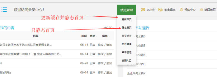 進入會員中心-----------訪問地址:域名/u.php-----------點擊更新首頁(包括了更新標簽緩存+靜態首頁)