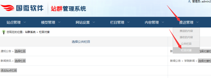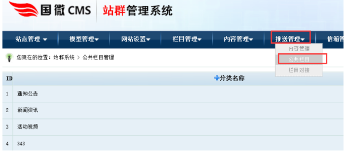 進入站群后臺---選擇推送管理----公共欄目;可以看到我們創(chuàng)建好的站群公共欄目