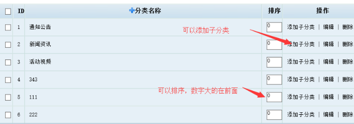 后面可以添加子分類的公共欄目,也可以編輯、刪除: