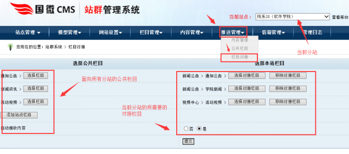 C:左邊選擇公共欄目;右邊選擇對應的本分站的欄目。那么主站推送的數(shù)據(jù),先推給公共欄目,然后自動流到對應的分站欄目。