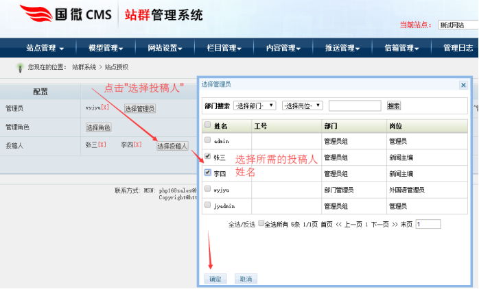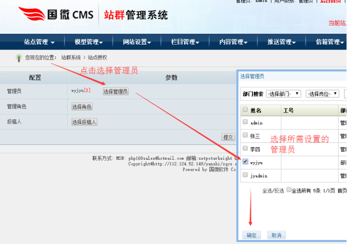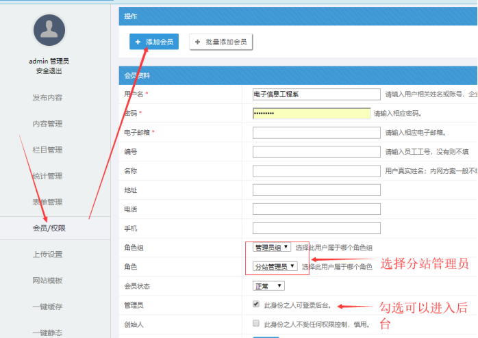 一、添加某分站的“管理員”和“投稿員”賬號