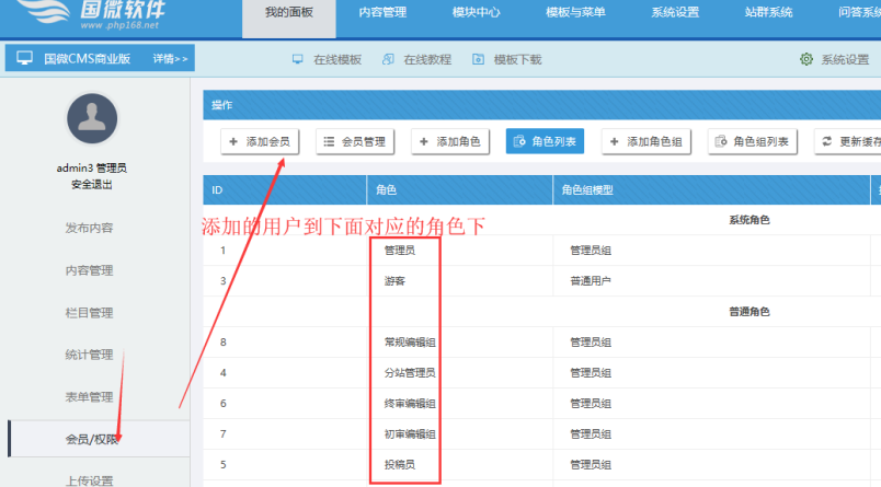 角色:在“普通用戶組”下面,就只有“普通用戶”角色;在“管理員組”下的角色有投稿員、分站管理員、欄目審核員等,這些角色都可以自定義無限新增,不是固定的,角色可以設置細分權限。