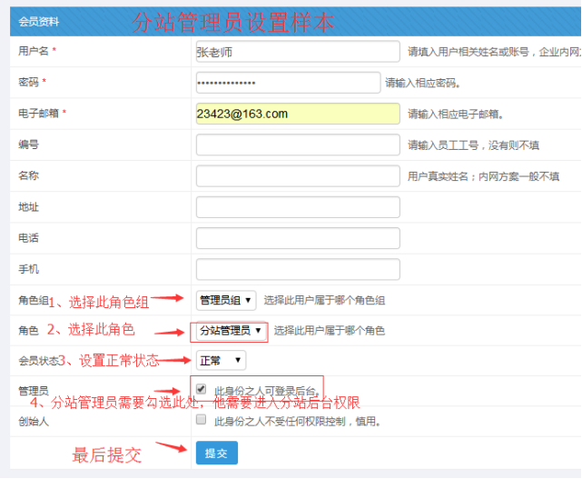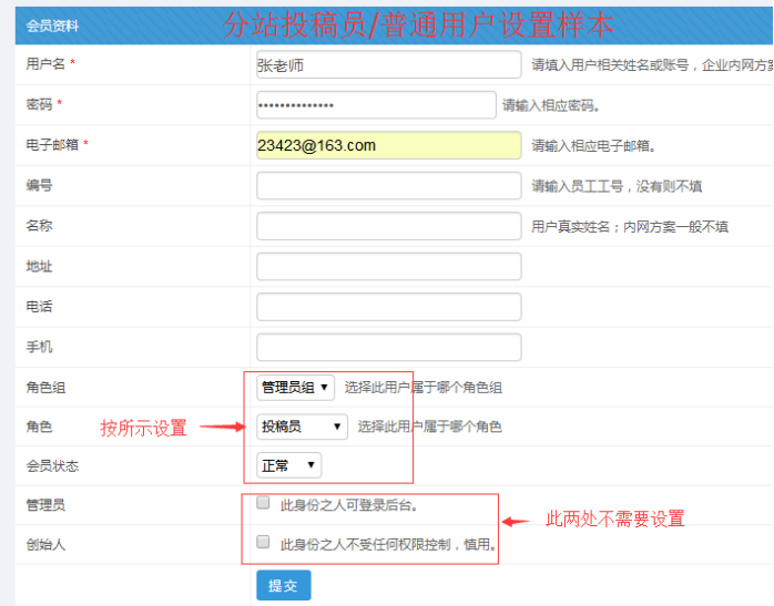 B:如果是站群的分站投稿員、主站的投稿員;添加賬號時候可以設置如下