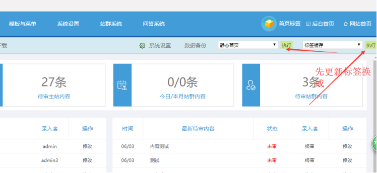 A:進入后臺-----執行(標簽緩存)------執行(靜態首頁) 就是分別更新了標簽緩存和靜態首頁了,最新發布的內容就可以在主站門戶顯示了。