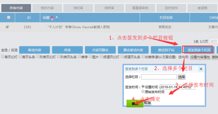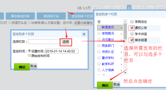 我們有時(shí)候需要將一篇或多篇內(nèi)容,簽發(fā)到多個(gè)欄目顯示,就可以用到“簽發(fā)到多個(gè)欄目”操作;相當(dāng)于在這些欄目重新發(fā)布了內(nèi)容。