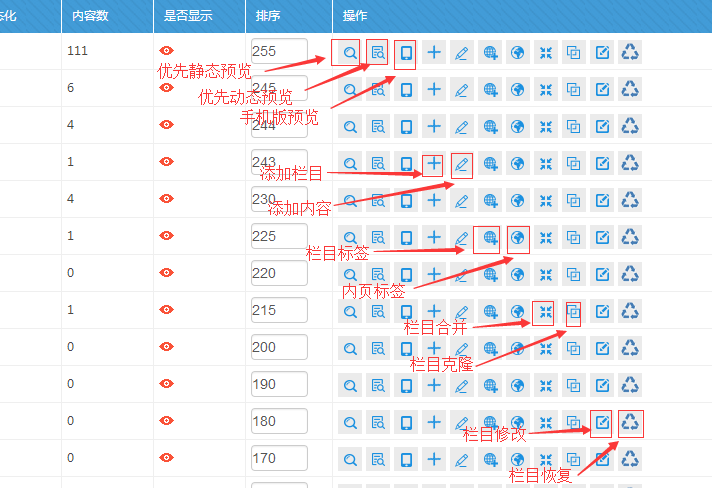 可以批量對欄目進行排序,數字大的排在前面;(根據類型字段,可以看到它是屬于大分類,還是欄目)
