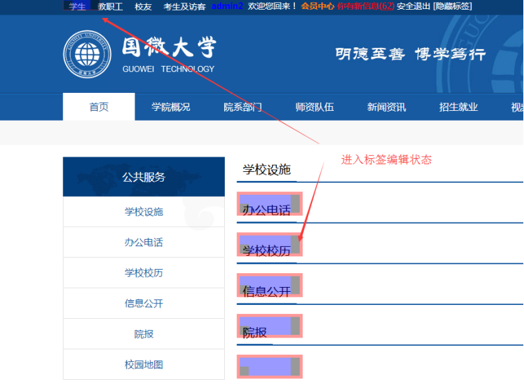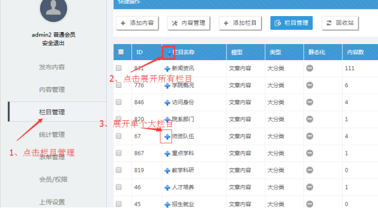 添加內容:在此欄目下添加內容(一般會員中心添加); 欄目標簽:點擊此處,可以進入此欄目的標簽可視化狀態