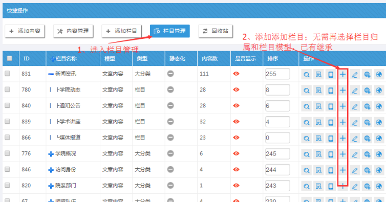 如果需要再后臺添加子欄目,點擊此處,這里添加欄目有個好處就是,不用再選擇欄目歸屬和模型,節省時間。