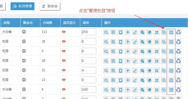 我們需要對欄目進行管理和修改,直接按如下操作; 網站后臺------點擊“欄目管理”------點擊修改按鈕: