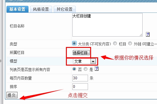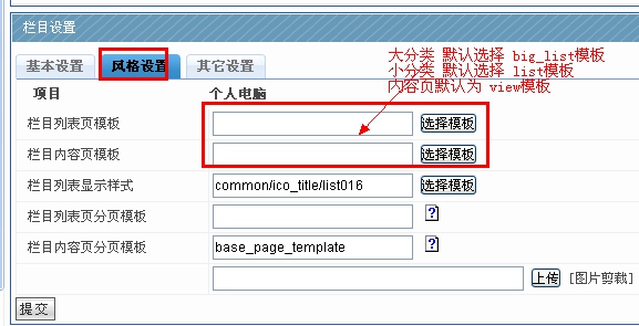 風格設置:就是所創建的欄目,他的列表模板樣式、內容頁模板樣式、列表模板上的標簽顯示樣式。一般均用默認的即可,無需選擇。