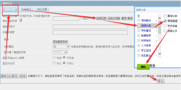 進入后,點擊基本設(shè)置-------點擊選擇欄目-----選擇需要顯示的欄目(可以多選)-------點擊確定-----最后點擊提交