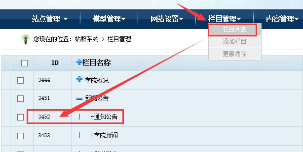 欄目ID的查看方法:進入分站后臺----點擊欄目列表------可以看到通知公告的欄目ID