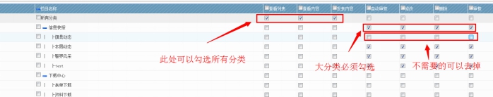B、如果我要選擇某個幾個欄目的管理權(quán)限,必須要先勾選它的上級欄目,如信息快報。然后將不是屬于自己的欄目的可以去掉勾選(這點很重要,大欄目必須要勾選的)。