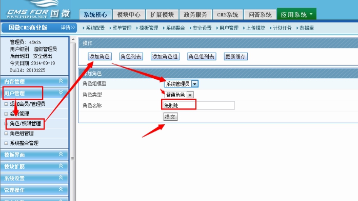 A、點擊用戶管理---角色/權(quán)限管理—添加角色,選擇系統(tǒng)管理員和普通角色即可,然后輸入你需要的角色名稱,如法制處。