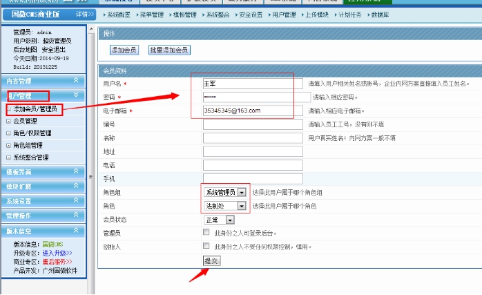 6、這個時候,就可以添加一個會員,給這個法制處的角色。比如,我增加:王軍。下面選擇系統(tǒng)管理員—法制處,不要弄錯。
