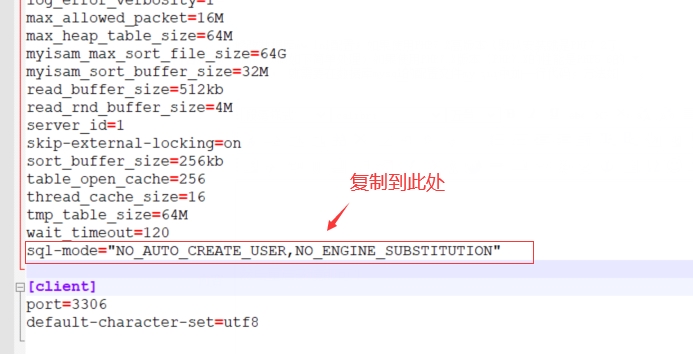 2)在A步驟中的目標my.ini數據庫配置文件中,將剛剛上面那行代碼復制到此處(其他行位置也可以),