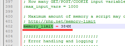 memory_limit = 285M // 在被取消之前,一個腳本可使用多少內存(字節)