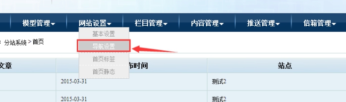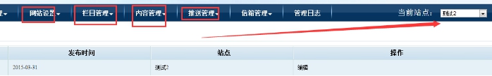 一旦右邊選擇了當前站點,比如”測試2”站點;那邊左邊導航的所有設置和內容都屬于該站點的;其中包括了網站設置、該網站的欄目管理、內容管理、推送管理等。反之,當前站點選擇了其他的,那么欄目和內容都是其他對應網站的。