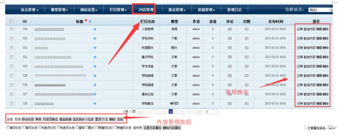 點擊內容管理,底部是內容操作按鈕,詳情可以見另外的操作;右邊是常見的操作按鈕。
