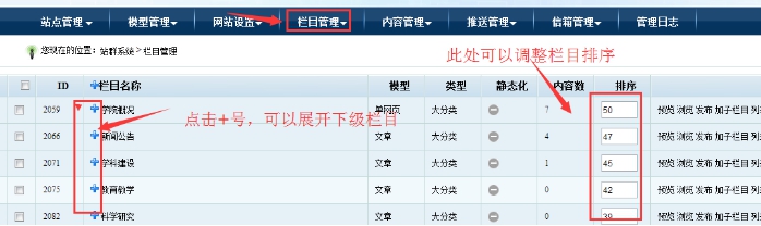 欄目排序:大的數(shù)字排在前面;數(shù)字大小是同級欄目比較。