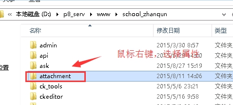 進(jìn)入服務(wù)器的該網(wǎng)站的根目錄,鼠標(biāo)選定 attachment 這個(gè)專(zhuān)門(mén)存放附件的文件夾,然后鼠標(biāo)右鍵,在彈出的選擇框中,選擇“屬性”