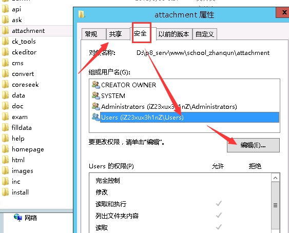 然后選擇 “安全”----選擇 users(有時(shí)候叫IUSER)這個(gè)角色,點(diǎn)擊編輯