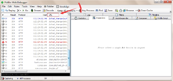 2,我們看到很多信息,要找到我們需要的網站很難 ,我們可以清空已經抓到的信息,電腦鍵盤“CTER+X”是清空的快捷鍵,清空后的結果: