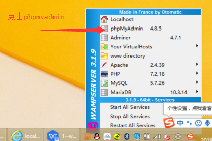 啟動wamp環(huán)境后,鼠標左鍵點擊,電腦右下角底部的WAMP的圖標,在彈出框中,選擇“phpmyadmin”