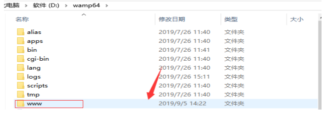 程序存放在D盤(假設你環境安裝的盤)---wamp64---www下---某某目錄(需要自己創建);