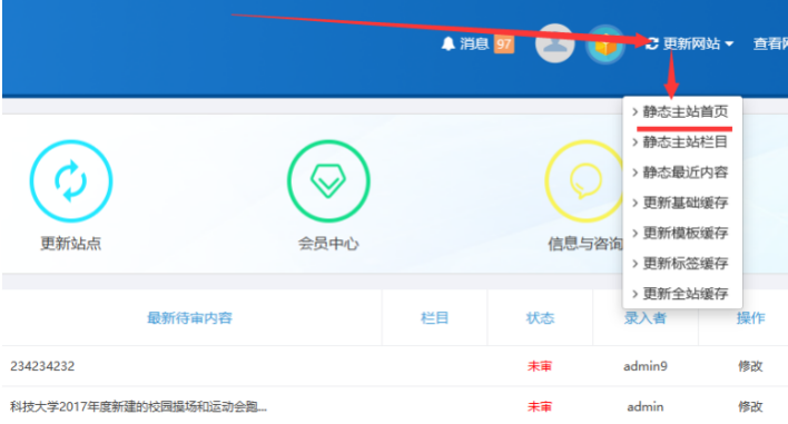 進入【主站后臺】后-------鼠標放在右上角【更新網(wǎng)站】按鈕上-----點擊【靜態(tài)主站首頁】-----最后快速連續(xù)刷新幾次首頁即可 :