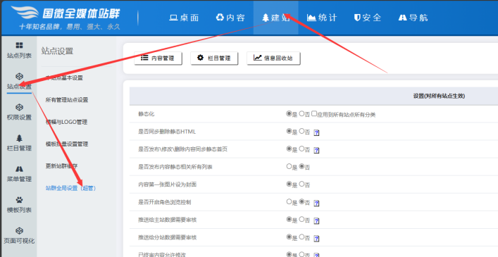 進入子站后臺后----點擊【建站】----點擊【站點設置】: