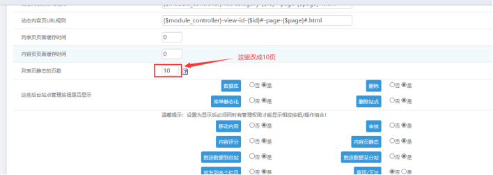 下面這個位置設置為:10 表示每次發布內容,子站欄目列表自動靜態前面10頁的內容,最后點擊提交