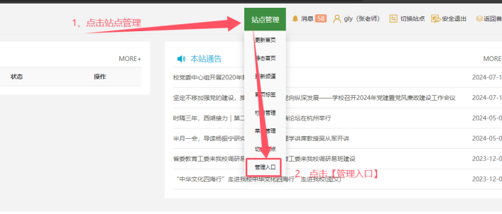 B、點(diǎn)擊【站點(diǎn)管理】----點(diǎn)擊【管理入口】,再次輸入賬戶密碼,進(jìn)入站點(diǎn)后臺
