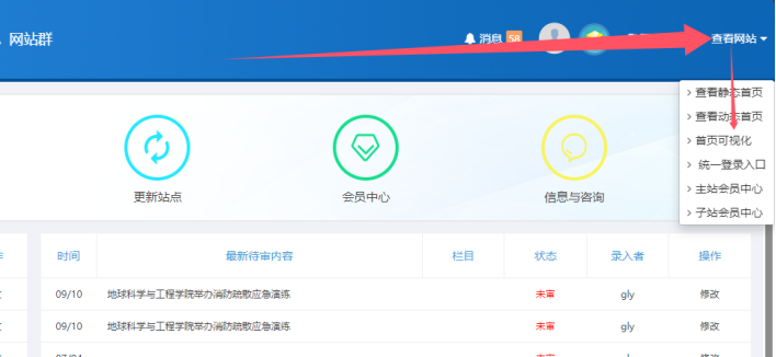 輸入賬號密碼后,進(jìn)入主站后臺界面------鼠標(biāo)放在【查看網(wǎng)站】上面------點(diǎn)擊【首頁可視化】-----進(jìn)入可視化查看: