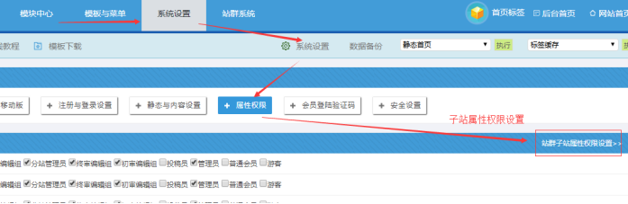 然后勾選各自角色所需的屬性功能;一般選擇“分站管理員”角色;讓分站管理員可以設置子站的屬性。當然對主站的終審編輯組也可以設置,他權限大點沒有關系。