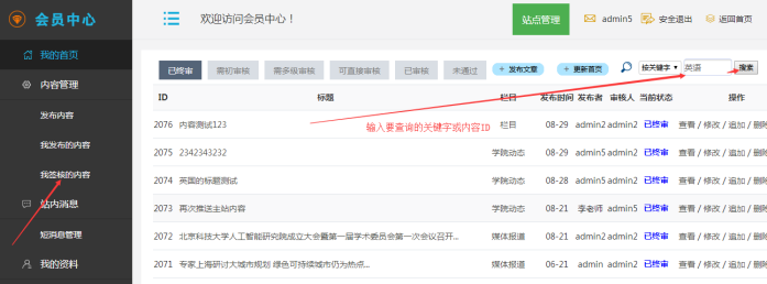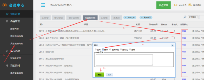 待審核的內容有兩種來源:一種是直接在主站會員中心投稿,一種是站群分站推送過來給主站的。