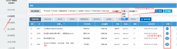 C:權重篩選:后臺--點擊內容管理----選擇權重----點擊搜索; 就可以看到設置了權重的所有內容