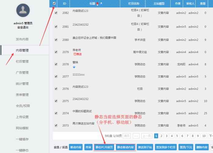 J:欄目和內容靜態(勾選欄目,分別點擊靜態欄目和靜態內容;前臺是靜態化屬于開啟狀態;如果有內容顯示不匹配,就考慮靜態化)