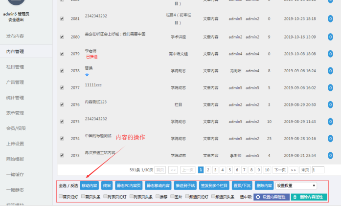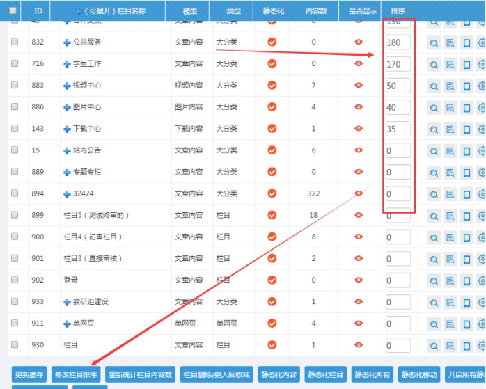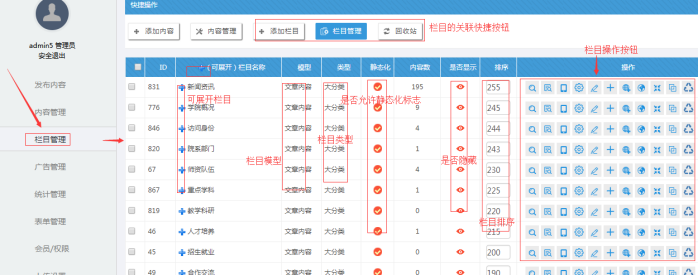 H:欄目刪除(如果需要刪除欄目,點擊此處,實際上進去了回收站,可以一鍵恢復)