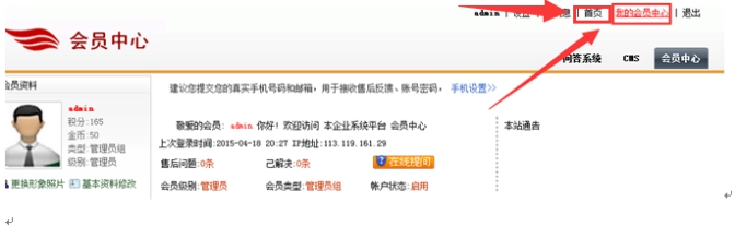 登陸后,會出現登陸信息,點擊“會員中心”四個字可以進入會員中心;會員中心的作用主要是發布、管理自己的內容;同時管理員審核內容的地方。