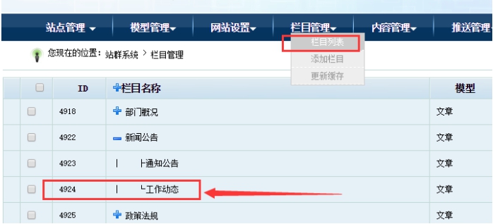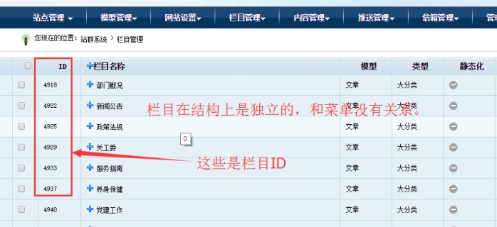 欄目:欄目是獨(dú)立的,和菜單沒有關(guān)系。左邊是欄目的ID號,每個(gè)欄目都有一個(gè)自己的ID。欄目如下圖: