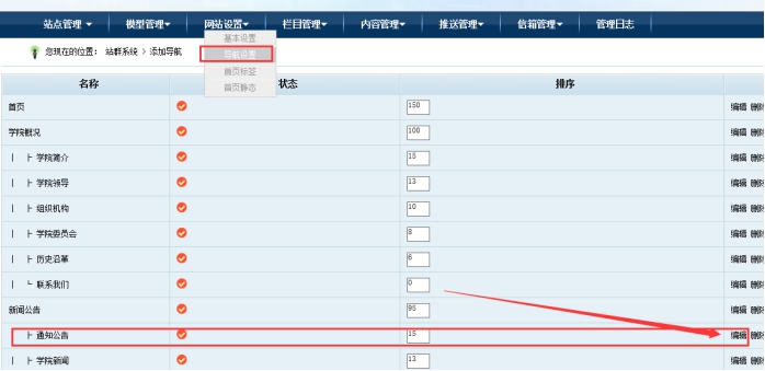 處理方法:分站后臺---網(wǎng)站設(shè)置---導(dǎo)航設(shè)置----點(diǎn)擊“通知公告”的編輯按鈕