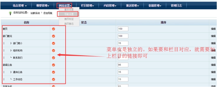 菜單:菜單也是一個(gè)獨(dú)立的東西,他事先本來和欄目沒有關(guān)系。要產(chǎn)生關(guān)系,就需要將菜單上填寫欄目鏈接地址。